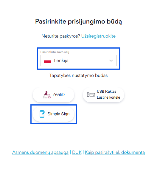 Svarbu! Prisijungimas ir pasirašymas per SimplySign Mark Sign platformoje šiuo metu galimas tik Lenkijos piliečiams.