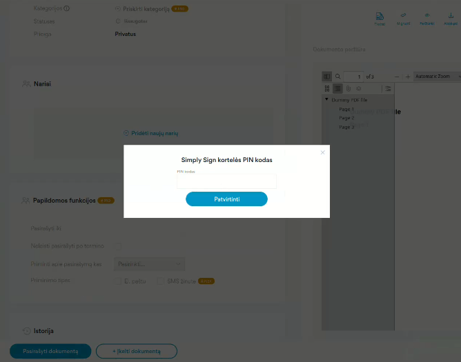 - Pasirašykite SimplySign įrankiu suvesdami savo kortelės PIN kodą ir spustelėdami „Patvirtinti“.