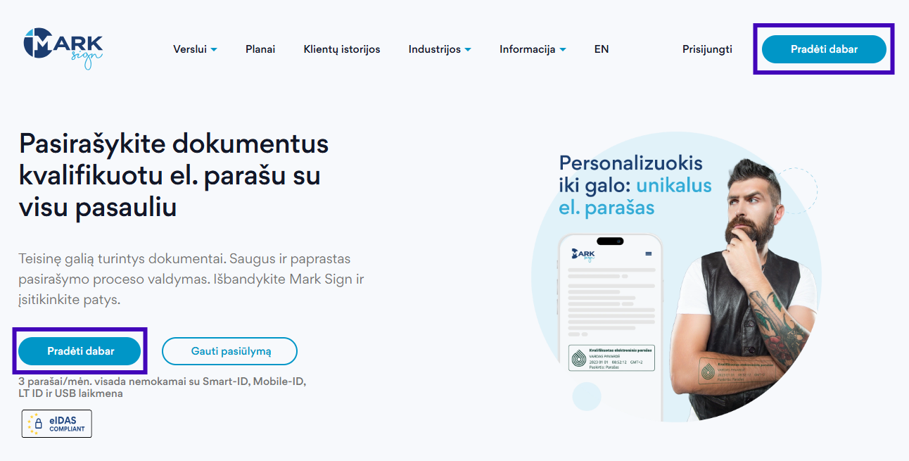 - Apsilankykite Mark Sign svetainėje bei pasirinkite „Pradėti dabar“ (arba eikite tiesiai adresu app.marksign.lt/register):