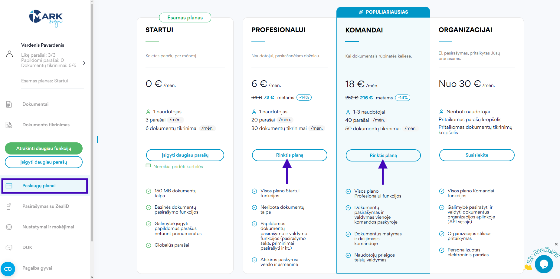1. Užsiregistruokite Mark Sign savitarnos platformoje, pasirinkite meniu juostoje esančią skiltį „Paslaugų planai“ bei išsirinkite norimą planą.