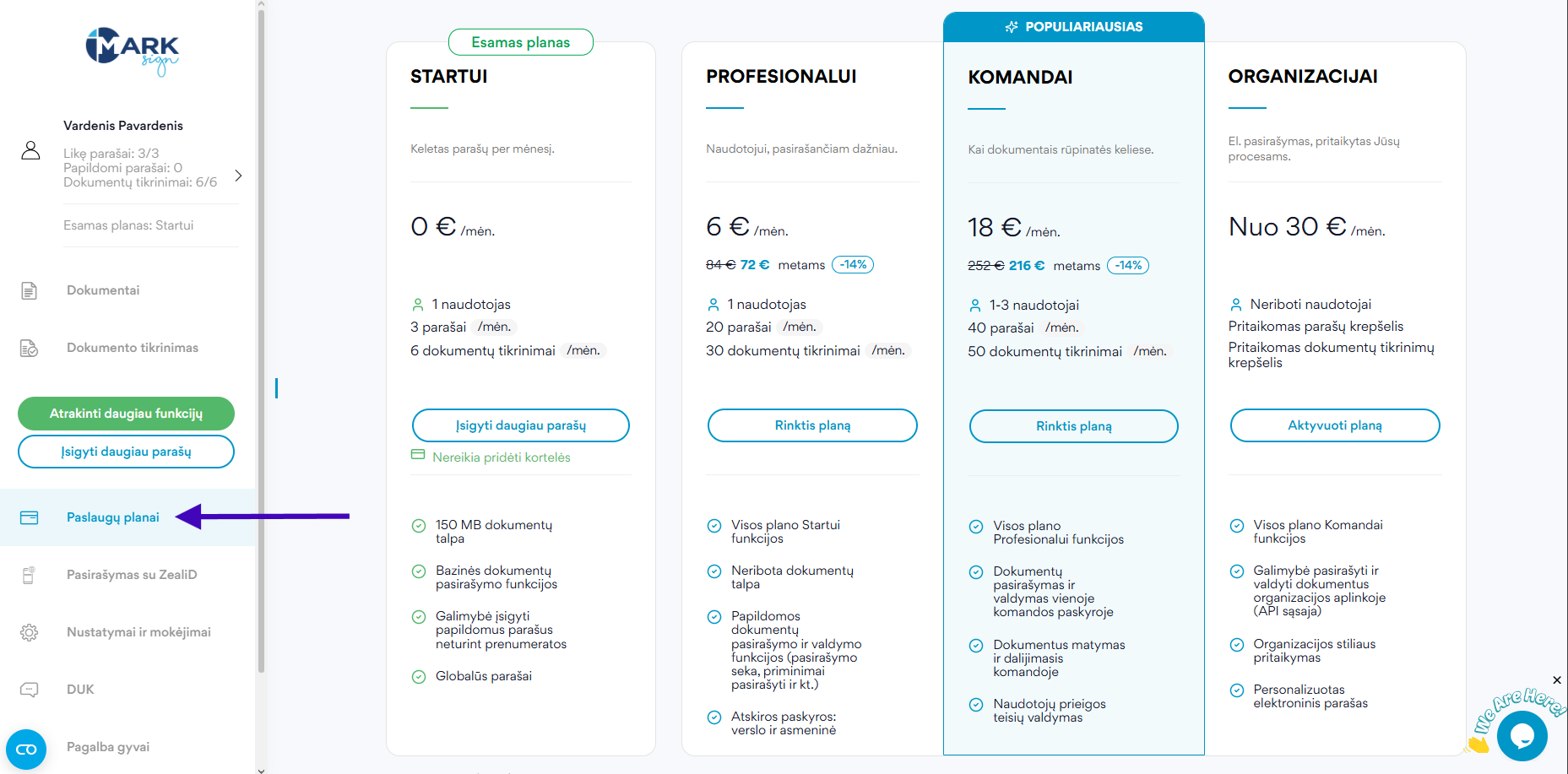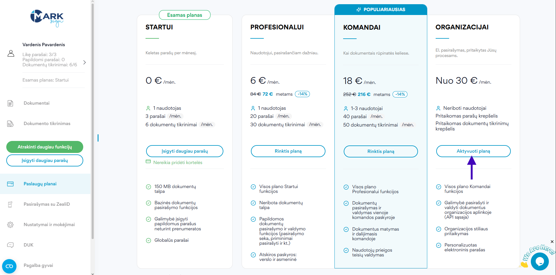 Pasirašę sutartį, susisiekite su asmeniniu Mark Sign vadybininku, kuris Jums priskirs planą Organizacijai. Jums teliks prisijungti prie savo paskyros bei ją aktyvuoti.