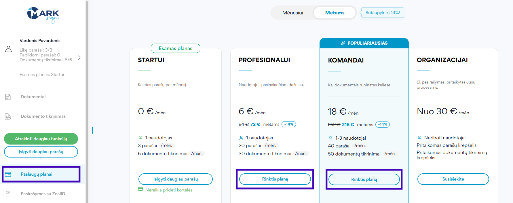 - Meniu juostoje eikite į skiltį „Paslaugų planai“ ir pasirinkę norimą planą, paspauskite mygtuką „Rinktis planą“;
