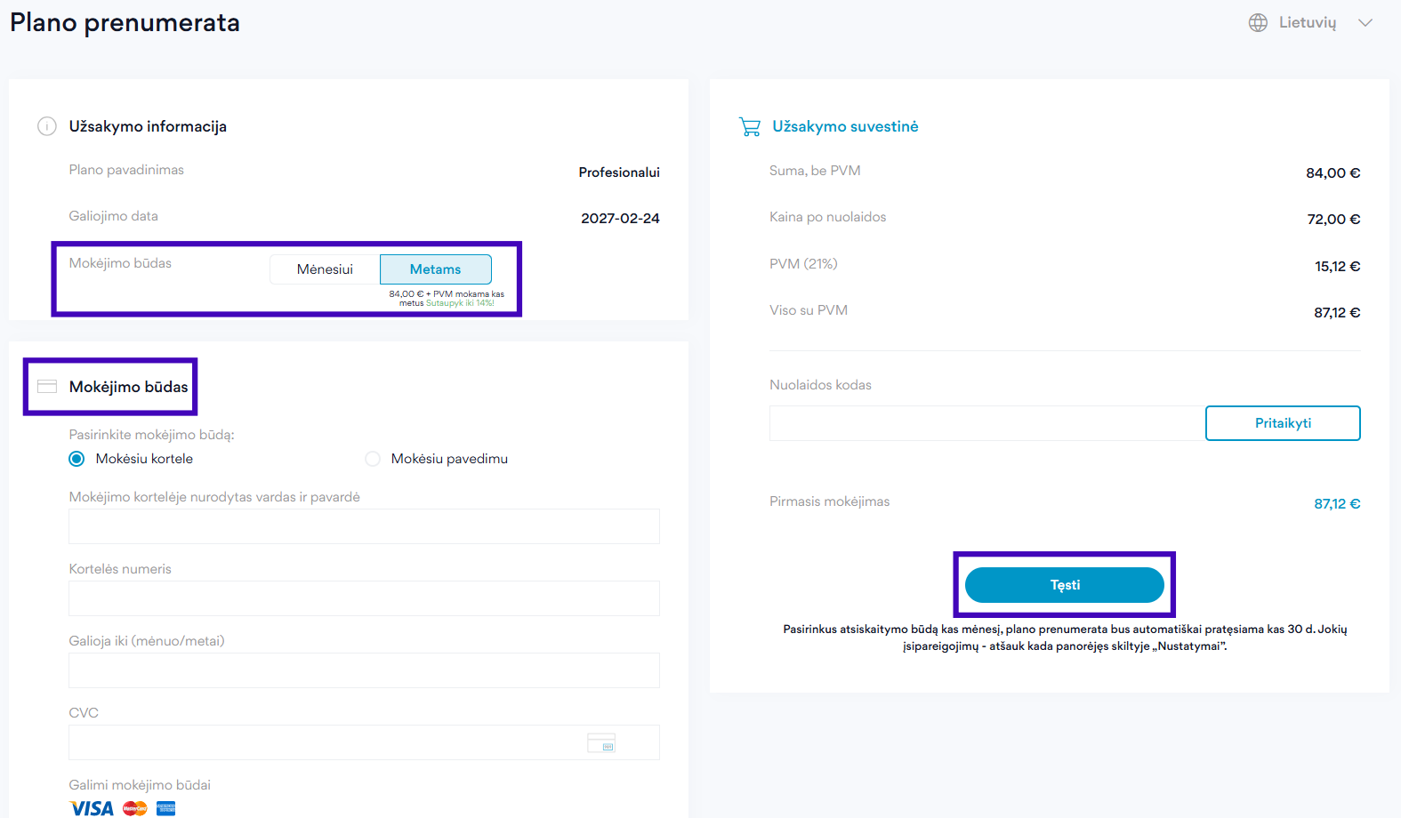 - Pasirinkite prenumeratos tipą (metinė arba mėnesinė), krepšelio lange suveskite reikiamus mokėjimo duomenis ir spauskite „Tęsti“.