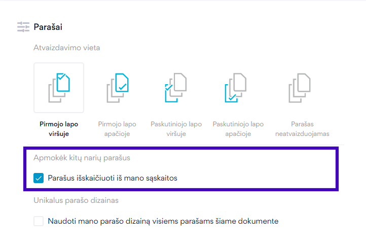 Su planu Profesionalui, Komandai ar Organizacijai įkeldami dokumentą galite pažymėti, kad norite, jog visų pasirašančiųjų parašus išskaičiuotų iš jūsų sąskaitos.